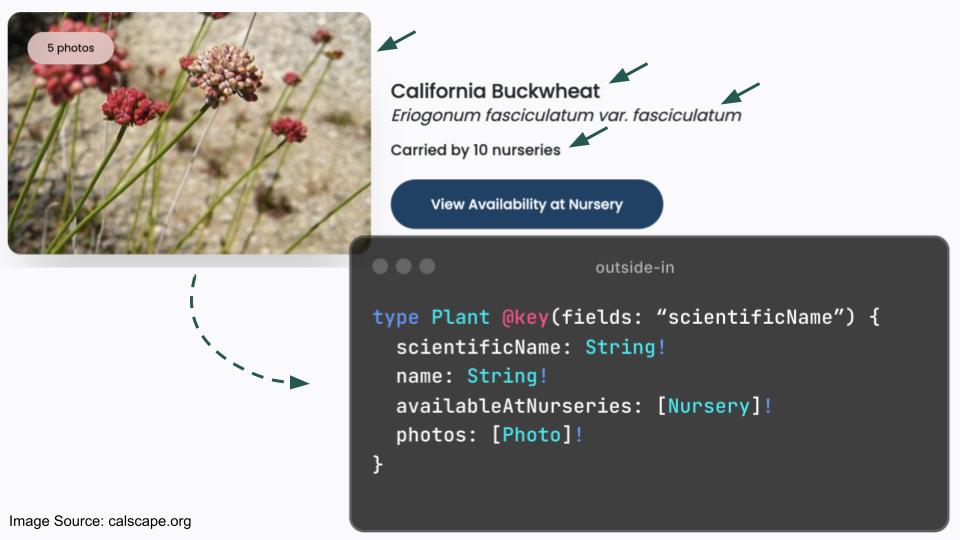 Ignoring pagination to keep this simple, we can see that this UI has some very clear requirements. Following the process, we look at all the different components and determine what belongs to the same “entity”. Again, this is based primarily on proximity and hierarchy. In this case, we can tell that all the data is referencing a single plant, so it makes sense to add this data as fields to a "Plant" type.